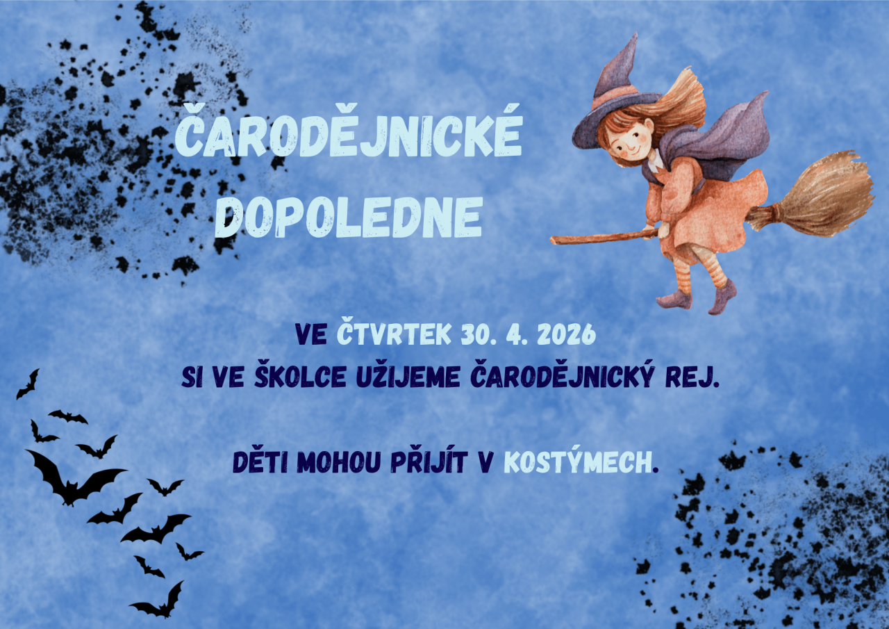 Dopolední akce ve školce v maskách čarodějů a čarodějnic.