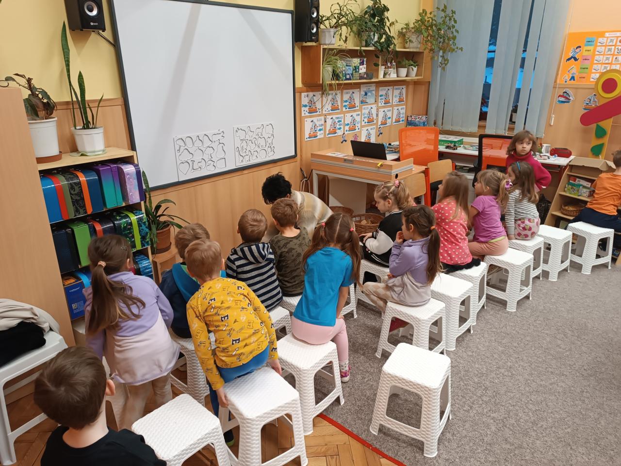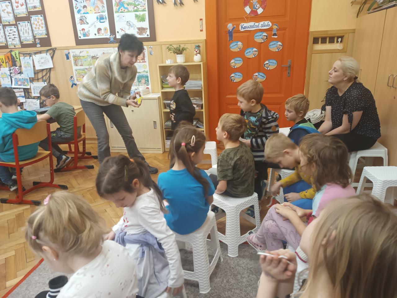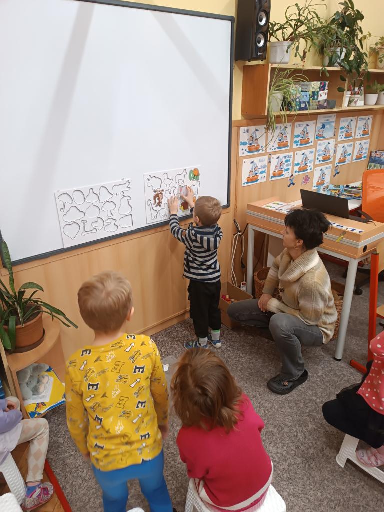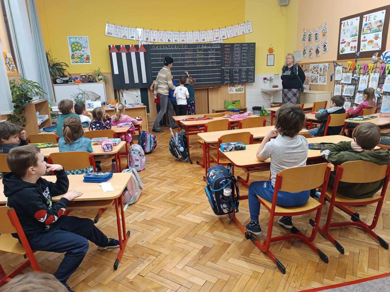 Páteční ráno využili naši předškoláci k návštěvě první třídy. Prvňáčci nám ukázali, jak už umí číst i psát. A předškoláci na oplátku ukázali svůj podpis na tabuli, vytleskávání slov na slabiky a určování prvního písmene ve slově.